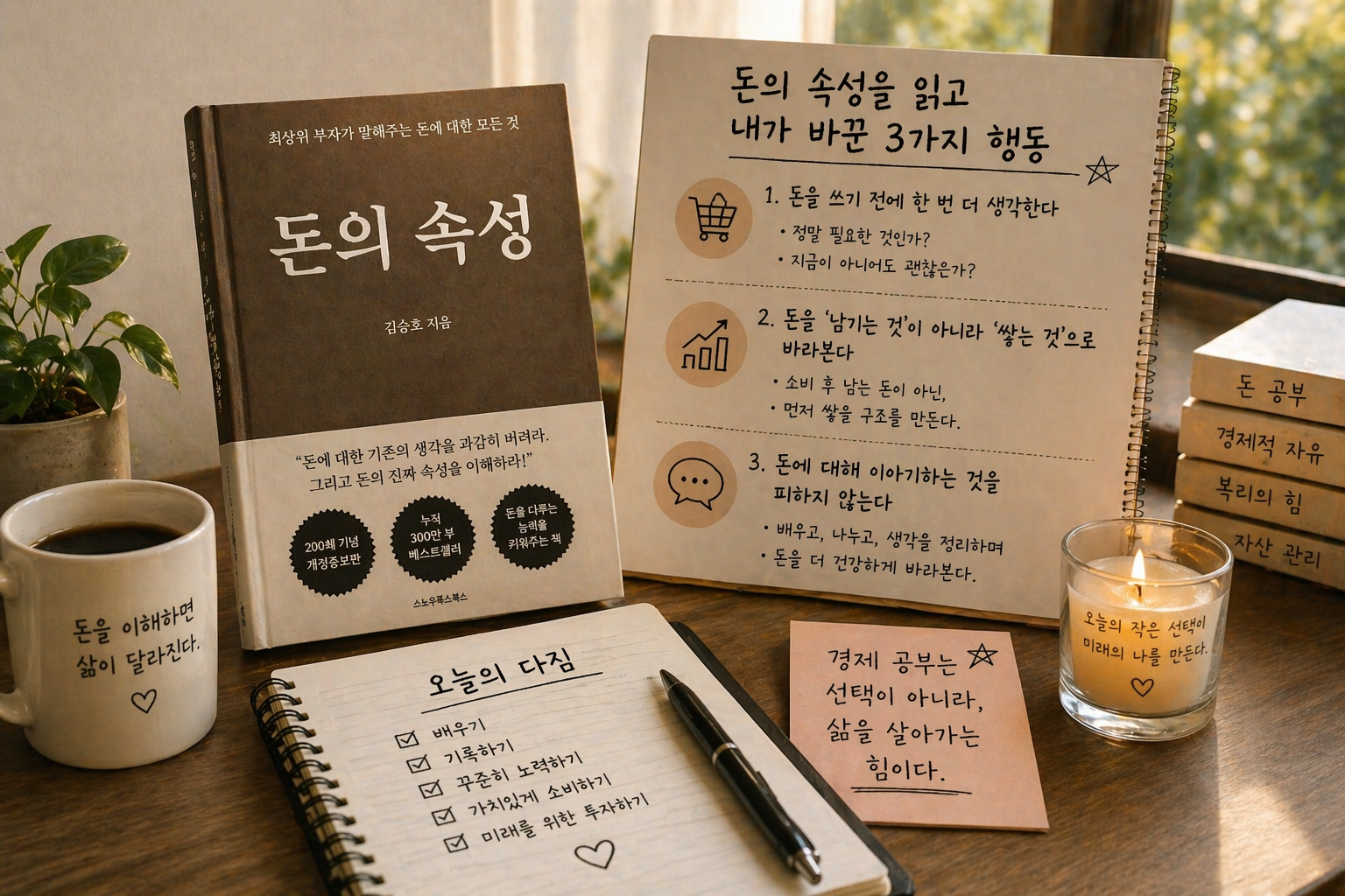 책을 읽는다고 해서 삶이 바로 바뀌는 것은 아니다. 나 역시 그걸 잘 알고 있었다. 좋은 문장을 읽고, 고개를 끄덕이고, 잠시 생각이 깊어지는 순간은 있지만, 다시 일상으로 돌아오면 결국 이전과 비슷한 선택을 반복하는 경우가 많았다. 그래서 책을 읽을 때마다 ‘이번에는 다르겠지’라는 기대보다는 ‘그래도 하나는 남겠지’라는 마음으로 읽었던 것 같다. 그런데 돈의 속성을 읽고 난 뒤에는 조금 다른 감정이 들었다. 단순히 좋은 이야기를 읽었다는 느낌이 아니라, 내가 그동안 너무 쉽게 생각했던 부분들을 하나씩 다시 보게 되는 계기가 되었기 때문이다. 거창한 변화는 아니었지만, 분명히 ‘행동’이 달라지기 시작했다. 이 글은 그 변화 중에서 내가 스스로도 가장 크게 느꼈던 세 가지를 정리한 기록이다.
