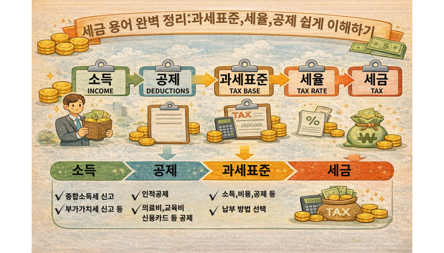 세금을 공부하다 보면 가장 먼저 막히는 부분이 바로 ‘용어’입니다. 과세표준, 세율, 공제, 납부세액 같은 단어들은 자주 등장하지만, 처음 접하는 사람에게는 낯설고 어렵게 느껴질 수밖에 없습니다. 특히 이 용어들을 제대로 이해하지 못하면 세금 계산 과정 자체가 흐릿하게 느껴지고, 결국 세금 전체가 복잡하게 보이게 됩니다. 하지만 반대로 말하면, 이 핵심 용어 몇 가지만 제대로 이해해도 세금 구조의 절반 이상은 이해했다고 볼 수 있습니다. 이 글은 세금 초보자를 위해 가장 중요한 핵심 용어들을 쉽게 풀어 설명하고, 실제 계산 흐름 속에서 어떻게 연결되는지를 자연스럽게 이해할 수 있도록 구성되었습니다. 단순히 정의를 외우는 것이 아니라, ‘아, 이렇게 이어지는구나’라는 흐름을 느끼는 것이 목표입니다. 지금부터 가장 중요한 개념들을 하나씩 살펴보겠습니다.