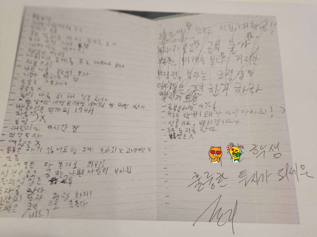 흥미로웠던 점은, 강연에서 들은 내용이 책과 거의 다르지 않았다는 것이다. 오히려 한결같았다. 꾸준함, 복리의 힘, 그리고 소비 습관의 중요성. 새로운 이야기를 기대했다기보다, 같은 이야기를 반복해서 듣게 되었는데 그 반복이 오히려 더 깊게 들어왔다. 왜냐하면 그 메시지가 단순한 지식이 아니라 ‘반드시 실천해야 하는 것’처럼 느껴졌기 때문이다.