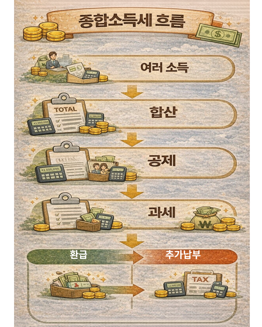 이 구조 때문에 많은 사람들이 예상하지 못한 세금 부담을 경험하기도 합니다. 따로따로 보면 크지 않은 금액이지만, 합쳐지는 순간 세금 기준이 달라지기 때문입니다. 그래서 종합소득세는 ‘합산’이라는 개념을 이해하는 것이 가장 중요합니다.