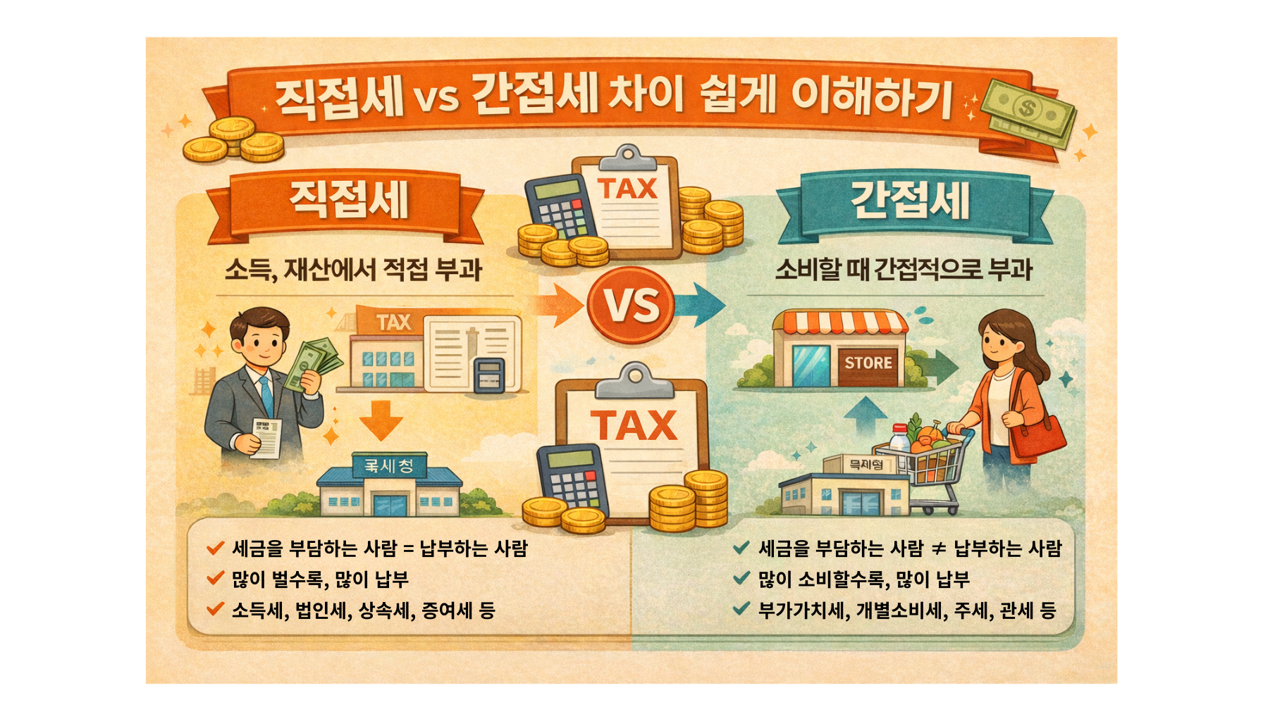 세금을 처음 공부하다 보면 가장 먼저 마주하게 되는 개념이 바로 ‘직접세’와 ‘간접세’입니다. 이름만 보면 단순히 직접 내느냐, 간접적으로 내느냐의 차이처럼 느껴지지만, 실제로는 우리가 돈을 벌고 쓰는 방식 전반에 영향을 주는 중요한 개념입니다. 많은 사람들이 세금을 어렵게 느끼는 이유는 용어가 낯설고, 일상과 어떻게 연결되는지 체감하기 어렵기 때문입니다. 하지만 이 두 가지 개념만 제대로 이해해도 세금의 큰 틀이 보이기 시작합니다. 이 글은 세금을 처음 접하는 분들을 위해 직접세와 간접세를 최대한 쉽게 풀어 설명하고, 실제 생활 속에서 어떻게 적용되는지까지 자연스럽게 연결해 이해할 수 있도록 구성되었습니다. 단순한 정의를 넘어, ‘그래서 내 삶에 어떤 영향을 주는지’까지 느낄 수 있도록 돕는 것이 핵심입니다. 세금은 피할 수 없는 존재이지만, 이해하는 순간 훨씬 덜 어렵고, 오히려 활용할 수 있는 영역으로 바뀝니다. 지금부터 그 첫걸음을 함께 시작해 보겠습니다.